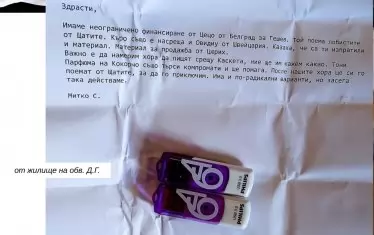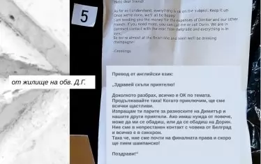 В едно от жилищата на Д.Г. също са били намерени и иззети наркотични вещества, множество банкноти от 50 и 100 евро, както и черен найлонов плик с бял лист с текст на английски език. Прокуратурата представи неофициален превод на въпросния текст. "Здравей скъпи приятелю. Доколкото разбрах всичко е ОК по темата. Когато приключим, ще сме всички щастливи. Изпращам ти парите за разноските на Димитър и нашите други приятели. Ако имаш нужда от повече, можеш да ми се обадиш или да се обадиш на Дорин. Ние сме в непрестанен контакт с човека от Белград и всичко е в синхрон. Така че ние сме почти на финалната права и скоро ще пием шампанско."