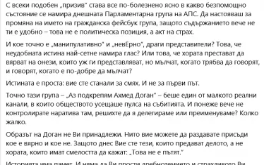 И сега, съвсем неочаквано, депутатите тръгнаха в атака срещу активистите. На "Фейсбук" страницата на пресцентъра на ДПС, която все още контролират, парламентарната група на АПС публикува снощи позиция, в която първо се отбелязва и хвали голямата роля на "Аз подкрепям Ахмед Доган" като "незаменим информационен канал". След това обаче се обвинява, че групата "драстично промени дългогодишния си добър тон на допустима градивна критика".