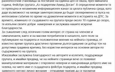 "Изказвайки заслужена благодарност на авторите и колегите, поддържащи групата, и имайки предвид, че на нейните страници вече се появяват манипулативни материали с откровено неверни и накърняващи доброто име на човека, на чието име е създадената "Фейсбук" подкрепа, и имайки предвид заявеното негово лично желание - отправяме призив да се промени наименованието ѝ", витиевато пише още в позицията. Иначе казано, твърди се, че самият Доган е поискал групата да се преименува. Не става ясно кога е казал той подобно нещо.