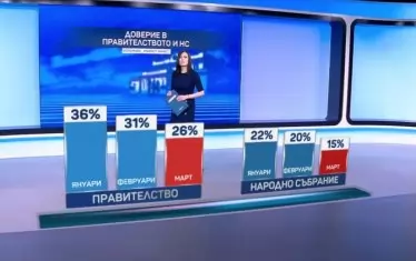 Данните от проучването показват още, че доверието към кабинета спада с 10% в сравнение с януари. Сходна е тенденцията и при доверието в Народното събрание, като от януари до март доверието е спаднало със 7%.