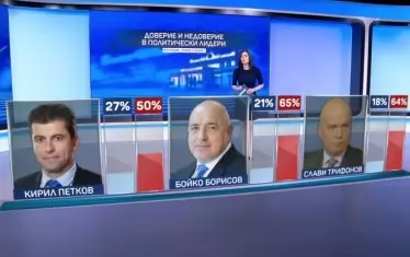 Кирил Петков продължава да е най-харесваният политически лидер у нас с 27% одобрение. На този фон недоверието срещу него е 50%. След него е председателят на ГЕРБ Бойко Борисов с 21% одобрение и 65% неодобрение. Слави Трифонов е предпочитан от 18% от анкетираните, а недоверието към него е 64%.
