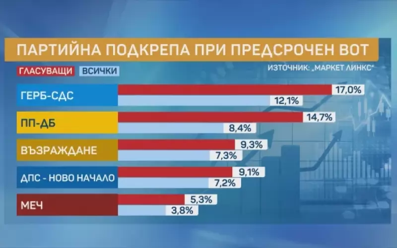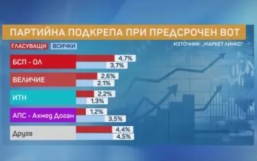 Разликата между ГЕРБ и ППI-ДБ е вече под 3 на сто, ДПС на Пеевски се е свила с 4 на сто, а при предсрочни избори в парламента ще влязат 6 партии. Това обяви социологът от „Маркет ЛИНКС“ Добромир Живков при представянето на резултатите от националното проучване. Изследването е финансирано и реализирано съвместно от bTV и „Маркет ЛИНКС“ и е проведено сред 1009 лица над 18 г. в страната в периода 3-7 декември по методите на пряко-лично интервю и онлайн анкета.