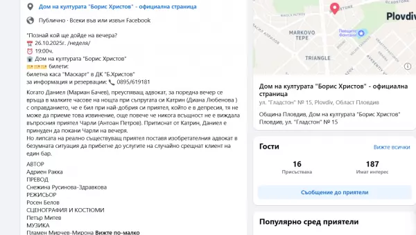 Постановката, която е на пазарджишкия театър, бе отдавна в афиша на Дом на културата "Борис Христов". След скандала вървяха информации, че няма да се играе. Но днес от касата заявиха, че се е състояла. Участието на самия Бачев бе потвърдено и от директор на дома Петя Щерева пред "Сега".
