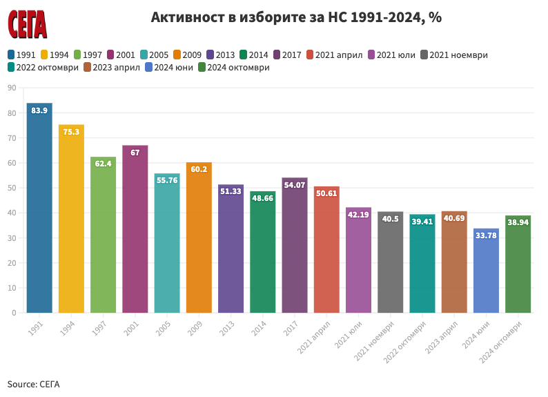 Към 11 часа, по информация на "Мяра", избирателната активност е 13,5% . Това е сравнително висок процент, като се има предвид, че през 2024 г. на изборите "2 в 1" избирателната активност е била 10,4 %.