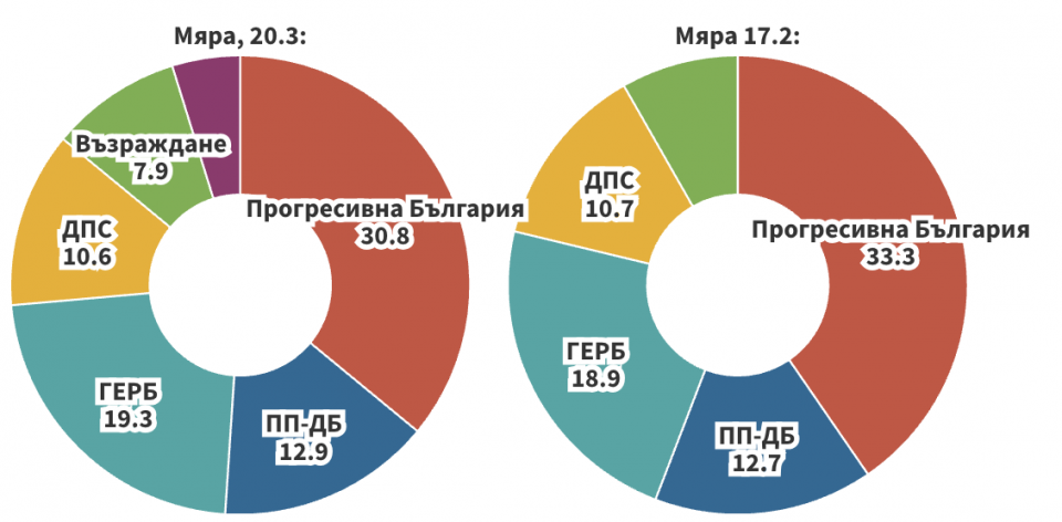 В предишното изследване на "Мяра" през февруари "Прогресивна България" имаше 33.3%, ГЕРБ-СДС - 18.9%.