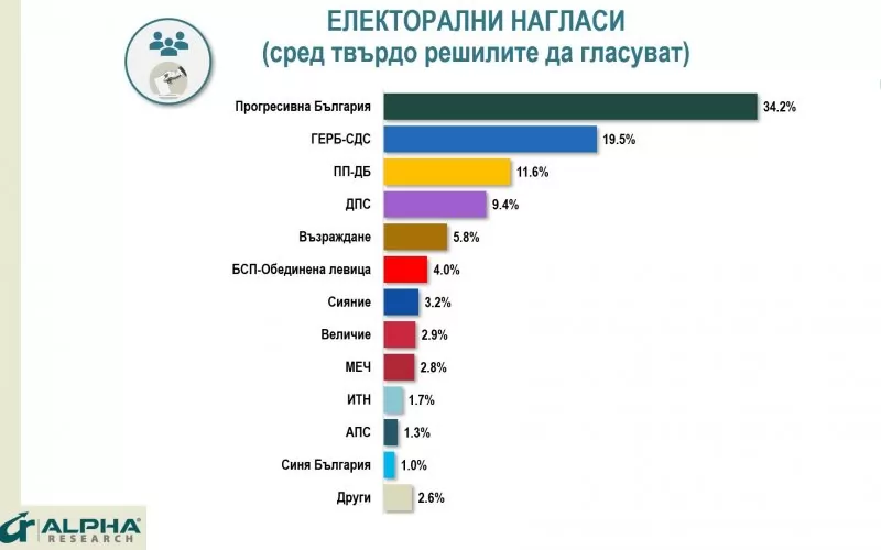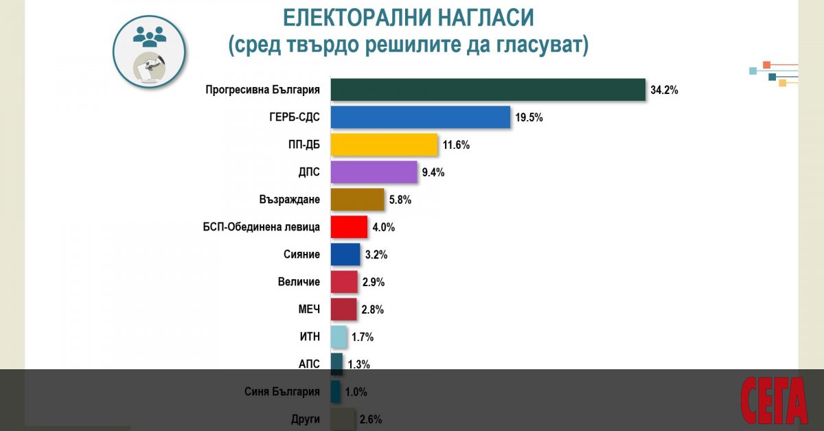 Данните на "Тренд", са, че Прогресивна България получава 33,2% подкрепа сред заявилите, че ще упражнят правото си на глас. Втори са ГЕРБ-СДС с 19,1%. Битката за третото място остава оспорвана, като ПП-ДБ (11,2%) запазва крехка преднина пред ДПС (10,2%). Петата позиция остава за „Възраждане“ със 7,1% сред гласуващите.
