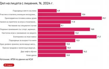 Материалните лишения при децата намаляват през 2024 г., но остават сравнително високи. НСИ оценява ограниченията при децата също по 13 показателя. Най-голяма част от децата - почти 1/4 (23%), са лишени от почивка извън дома, 21% нямат екипировка за игри навън (колело, ролери, кънки и др.), а 19% не могат да участват в редовни занимания с плуване, свирене на музикален инструмент и други.