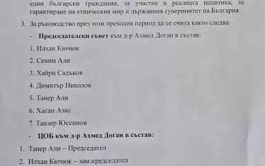 За това време ръководството на неговата фракция ще се съсредоточи в два органа: първо, председателски съвет, воден от евродепутата Илхан Кючюк, в който ще влизат Севим Али, Хайри Садъков, Димитър Николов, Танер Али, Хасан Азис, Танзер Юсеинов; второ, Централно оперативно бюро с председател Танер Али и заместници Илхан Кючюк, Севим Али, Хайри Садъков, Димитър Николов, Хасан Азис, Танзер Юсеинов и членове Джейхан Ибрямов, Павлин Кръстев, Хюсни Адем, Красимир Красимиров, Ахмед Вранчев, Ремзи Осман, Рамадан Аталай, Хасан Адемов, Левент Мемиш, Мехмед Салим и Севинч Солакова.