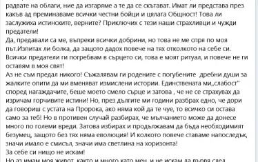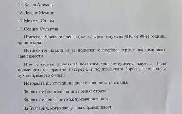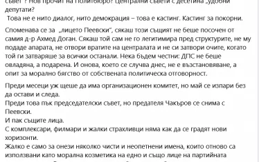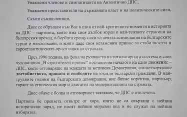 В документа Доган констатира, че сега е "един от най-критичните моменти в историята на ДПС". "Днес обаче с болка и отговорност заявявам, че ДПС е отвлечена. Партията бе превзета отвътре от хора, които не са свързани с нейния исторически заряд, не носят нейния морален код и не служат на нейния избирател. Лицето Делян Пеевски, без политическа легитимност, без идеологическа последователност и с дълбоки зависимости, успя да овладее ръководството на партията чрез методи, които нямат нищо общо с демокрацията- заплахи, натиск, зависимости, овладяване на институциите и злоупотреба с власт", разказва той своята версия за случилото се с партията.