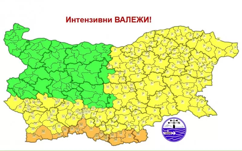 Оранжев код за интензивни валежи е обявен за част от общините в Южна България. "Очакват се значителни валежи, с количество за денонощието 25-35 mm, на места около и над 50 mm", съобщава НИМХ. В някои общини има има и жълт код за вятър. Той ще бъде от юг-югозапад, със средна скорост 14-19 m/s и пориви до 24 m/s, предупреждават метеоролозите.