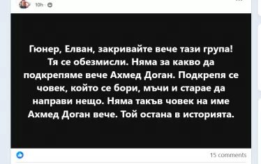 Това отприщи порой от подобни постове, включително и такива с негативно отношение към почетния лидер. Един от потребителите направо призова за закриването на групата, тъй като вече се обезсмислила. "Няма за какво да подкрепяме вече Ахмед Доган. Подкрепя се човек, който се бори, мъчи и старае да направи нещо. Няма такъв човек на име Ахмед Доган вече. Той остана в историята", написа той.