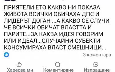 "Приятели, ето какво ни показа животът. Всички обичаха ДПС и лидера Доган ... А какво се случи, че всички обичат властта и парите ... за каква идея говорим или идеал ... случайни субекти консумираха власт, смешници", написа потребителят Демир Демирел.
