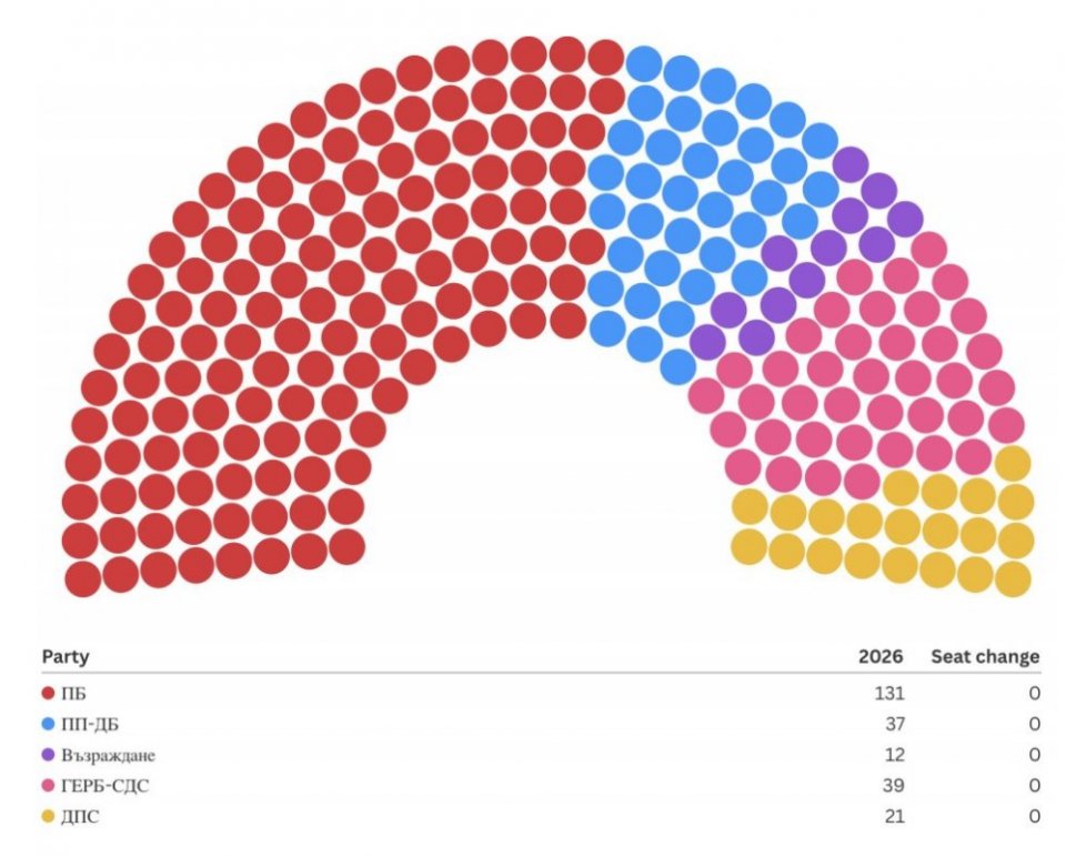 Сметките показват, че с получената подкрепа "Прогресивна България" ще разполага със 131 депутати, ГЕРБ-СДС - с 39, 37 банки са за депутатите от ПП-ДБ, ДПС ще разполага с 21 депутати, а "Възржаждане" - с 12.