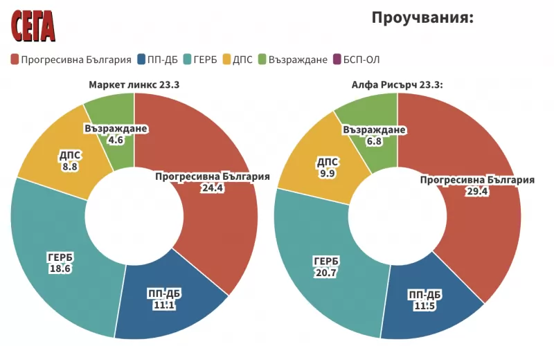 Класирането при "Маркет Линкс" е същата, но с малко по-различни числа: "Прогресивна България" с 24.4%, ГЕРБ - 18.6%, ПП-ДБ - 11.1%, ДПС - 8.8% и "Възраждане" - 4.6%. Отново най-близо до бариерата, без да успеят да я прескочат, са партиите на Крум Зарков (3.1 на сто) и на Радостин Василев (2.7 на сто).