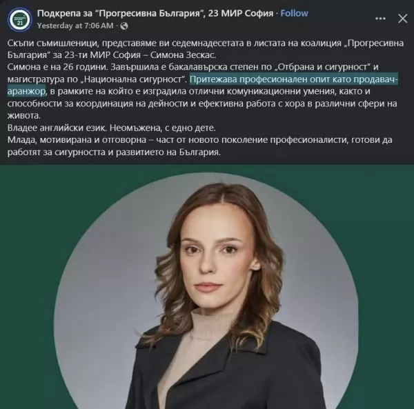 Друг представител на обединението – Мартин Грозев, се е ориентирал към "Прогресивна България", водена от бившия президент Румен Радев. В листите на коалицията има още представители на младото поколение, някои от които нямат никакъв опит в живота. Такава например е 26-годишната Симона Зескас, която е завършила "Отбрана и национална сигурност", но е работила като продавач-аранжор, където е развила комуникационни умения. 21-годишният Веселин Илов пък дори още не е завършил - той е студент втори курс "Бизнес администрация" в УНСС.