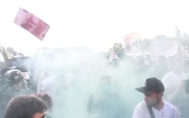 Напрежението се покачи между 12 и 12.30. Протестиращи започнаха да мятат бомбички. Полицията отвърна с газ. От "Системата ни убива" пък разпиляха слама пред част от полицейския кордон, с намерение да я палят. На стотина метра от тях протестиращ припадна, откаран бе с линейка.