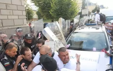 Към 9.50 отново избухна сблъсък краай полицейския кордон. Протестиращи отново клатят микробус на МВР. Полицаи пръскат със спрей. Протестиращи хвърлят вода по тях. От лютивия спрей пострадаха и журналисти. На мястото е ген. Шивиков, част от протеста. Жени се мъчат да успокоят страстите - дават карамфили на полицаите. Протестиращи обаче се мъчат да атакуват и централния вход на бившия Партиен дом.