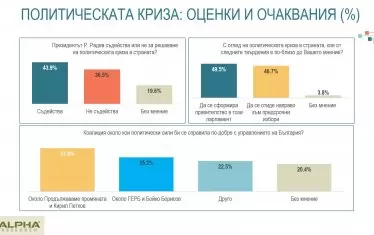 43.9% смятат, че Радев спомага за преодоляването на политическата криза у нас, но 36.5% са на обратното мнение. Това поставя в по-слаби позиции евентуално служебно правителство на Радев, от което се очаква да бъде медиатор в кризата, а не да води до нейното изостряне, смятат социолозите. Най-силно е преобръщането на мненията сред симпатизантите на ДБ, които се доближават по отрицателни оценки до тези на ГЕРБ.
