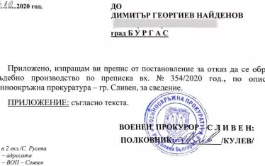 Военноокръжната прокуратура в Сливен няма да разследва охранителите от Националната служба за охрана, които през юли в парк "Росенец" си позволиха да изблъскат от държавния бряг съпредседателя на "Демократична България" Христо Иванов. Един от гардовете дори захвърли на земята българския флаг. Случаят се разигра на плажа пред имението на почетния лидер на ДПС Ахмед Доган.