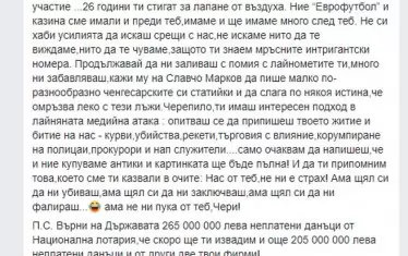 Разделяме се и в Еврофутбол,и в 12 те игрални зали,където имаш участие ...26 години ти стигат за лапане от въздуха. Ние “Еврофутбол” и казина сме имали и преди теб,имаме и ще имаме много след теб. Не си хаби усилията да искаш срещи с нас,не искаме нито да те виждаме,нито да те чуваме,защото ти знаем мръсните интригантски номера. Продължавай да ни заливаш с помия с лайнометите ти,много ни забавляваш,кажи му на Славчо Марков да пише малко по-разнообразно ченгесарските си статийки и да слага по някоя истина,че омръзва леко с тези лъжи.Черепило,ти имаш интересен подход в лайняната медийна атака : опитваш се да припишеш твоето житие и битие на нас - курви,убийства,рекети,търговия с влияние,корумпиране на полицаи,прокурори и нап служители....само очаквам да напишеш,че и ние купуваме антики и картинката ще бъде пълна! И да ти припомним това,което сме ти казвали в очите: Нас от теб,не ни е страх! Ама щял си да ни убиваш,ама щял си да ни заключваш,ама щял си да ни фалираш...? ама не ни пука от теб,Чери!