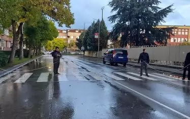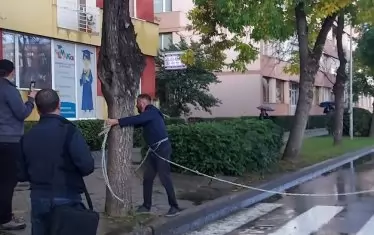 Протестиращи се завързаха с верига пред полицията в Благоевград.