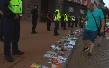"Довечера елате с книга, това ни дели", призова Отровното трио преди началото на 33-ия ден на протестите срещу правителството и главния прокурор Иван Гешев. Хората последваха съвета и изградиха кордон от книги на жълтите павета в краката на охраняващите Министерския съвет униформени. Сред книгите имаше и учебници, и екземпляри на "Винету" от Карл Май. Напрежение в началото на протеста предизвика възрастен човек, който започна да скандира към подиума с говорещите "Не искам да ви слушам". Човекът взе да спори с охраната и бе изстласкан назад. Охраната обясни, че човекът е влизал в спор с присъстсващите и е настоявал, че не иска никакви оставки. "Казахме на управляващите да не пращат провокатори, но явно продължават", коментираха от охраната.
