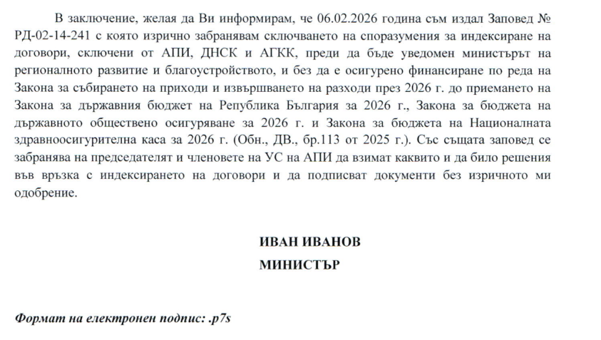 Възможно е индексирането на договори да е станало в нарушение на заповед на бившия регионален министър Иван Иванов. В отговор на депутатски въпрос за индексация на инхаус договори на "Автомагистрали" Иванов на 18 февруари отговори, че такива индексации няма. Той обясни, че със заповед от 6 февруари е забранил всякакви индексации на договор без негово съгласие и без осигурен финансов ресурс в условия на отсъстващ бюджет. Индексациите на стари договори за пътно поддържане са предприети след заповедта на Иванов. Ако няма нарушение на заповедта, това би означавало, че Иванов е допуснал анексирането.