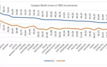 Сред регионите с най-висок среден брой точки и по двата предмета отново са София-град, Варна и Смолян. Най-нисък е средният резултат в Сливен, Видин и Силистра, като през тази година към тях се присъединява и Монтана.