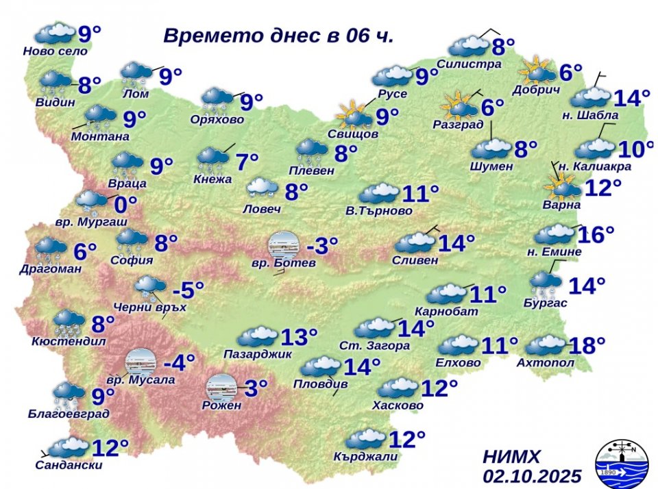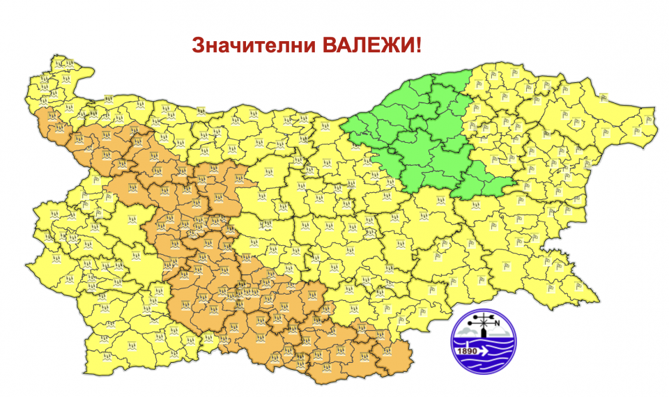 Оранжев код за днес е издаден за областите Видин, Враца, Монтана, Ловеч, София област, Пазарджик, Смолян, Пловдив и Кърджали. Най-големи количества дъжд се очаква да паднат в областите Пловдив, Смолян и Пазарджик. За много общини има предупреждение, че ще натрупа снежна покривка до 10 см, както и за опасност от чупене на клони и падане на дървета от натрупан сняг.