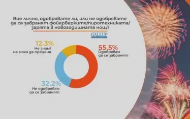 На въпроса "Одобрявате ли да се забранят фойерверките/пиротехниката/зарята в новогодишната нощ?" 55,5% от хората отговарят "да". 32,2% от анкетираните не одобряват подобна забрана, а 12,3% не могат да преценят.