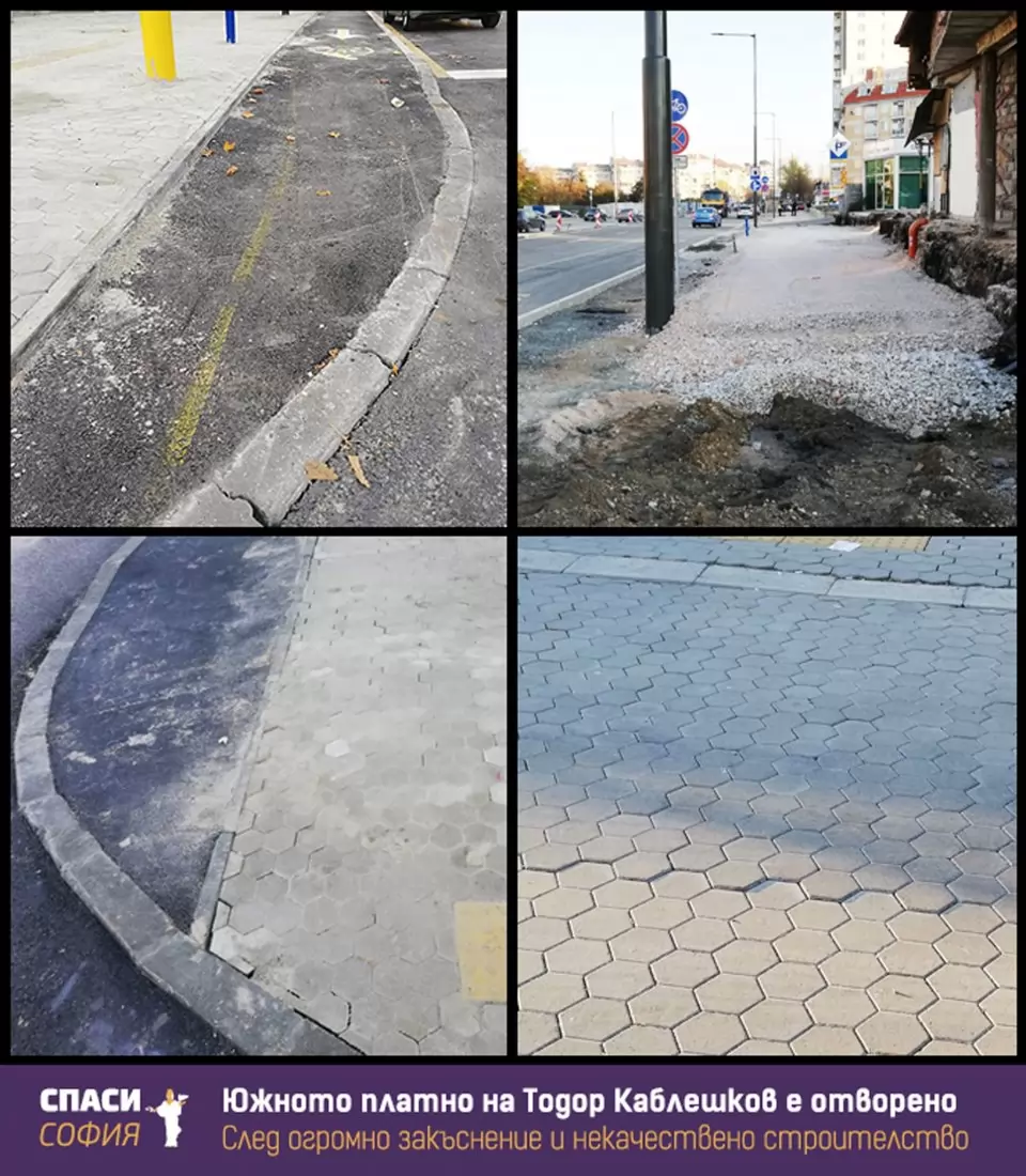 На места бордюрите по ремонтирания булевард са изключително ниски, личи от друга снимка. Плочки по тротоарите вече са разместени и "плаващи", се вижда на трета. "Така изглежда поредният ремонт на Йорданка Фандъкова - 11 млн. лв. инвестирани в некачествен ремонт, без никакъв общински контрол и без санкции за мърлявата и закъсняла работа на изпълнителя. Всичко това се случи буквално пред очите на кмета, която живее на 100 метра от бул. "Тодор Каблешков", който по думите ѝ е приоритет №1, откакто е начело на София. Нямаме никаква надежда, че това управление някога ще се научи да прави нещата както трябва - с добър проект, спазвайки сроковете и с европейско качество", гласи коментарът на "Спаси София".