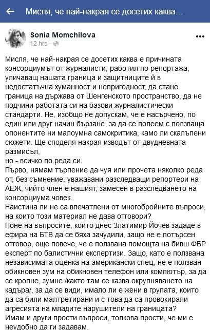 В изтрития вече пост Момчилова поставя под съмнение достоверността на репортажа и го критикува, че не търси гледната точка на засегнатата страна - МВР и Гранична полиция. (Което не е вярно) Намеква се също, че журналистката е била предварително мотивирана за работата си „някъде в шенгенските ширини“, правейки препратка към поредния отказ страната ни да бъде допусната в шенгенското пространство.