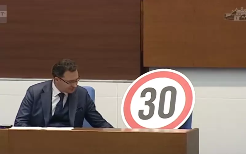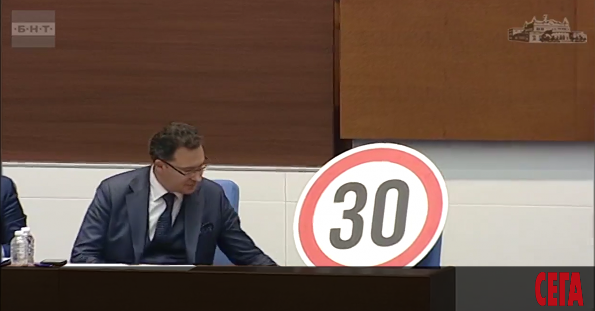 Елисавета Белобрадова излезе и постави до министъра пътен знак със забрана за по-висока скорост от 30 км/ч. Тя обясни, че това е "символ и медал" за това, че министърът не е казал нищо вярно за инцидента в Русе (медии показаха поставянето на пътния знак там - бел.а.). Митов коментира, че МВР не поставя знаци. Съпартиецът му Делян Добрев посъветва Белобрадова да върне знака откъдето го е взела, за да не стане катастрофа. А Станислав Балабанов я попита защо не донесе асфалт в чувал от трасето, на което бившият лидер на ПП Кирил Петков е катастрофирал.