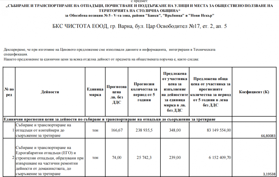 Справка в ценовите оферти показва, че това се разминава с фактите. Ценовата оферта на "БКС-Чистота" за пета зона за най-скъпата дейност - сметосъбиране и сметоизвозване, е 348 лв. на тон без ДДС при 166.67 лв. прогнозна цена на общината. Общата ценова оферта за зоната е 113 279 191 лв. при прогнозна стойност на общината 47 930 280 лв. За втора зона "БКС-Чистота" е дало оферта от 325 лв. без ДДС за основната дейност при 166.67 лв. на общината и крайна оферта от 71 806 040 лв. Тук прогнозната на общината е 75 849 885 лв., но както писаха и "Сега", и "Медиапул", при смятането на прогнозните стойности в поръчката има грешки. За "Красно село" и "Люлин", където единствената оферта е на фирма, свързвана с Христофор Аманатидис-Таки, цената за сметосъбиране и сметоизвозване на тон е 349 лв.