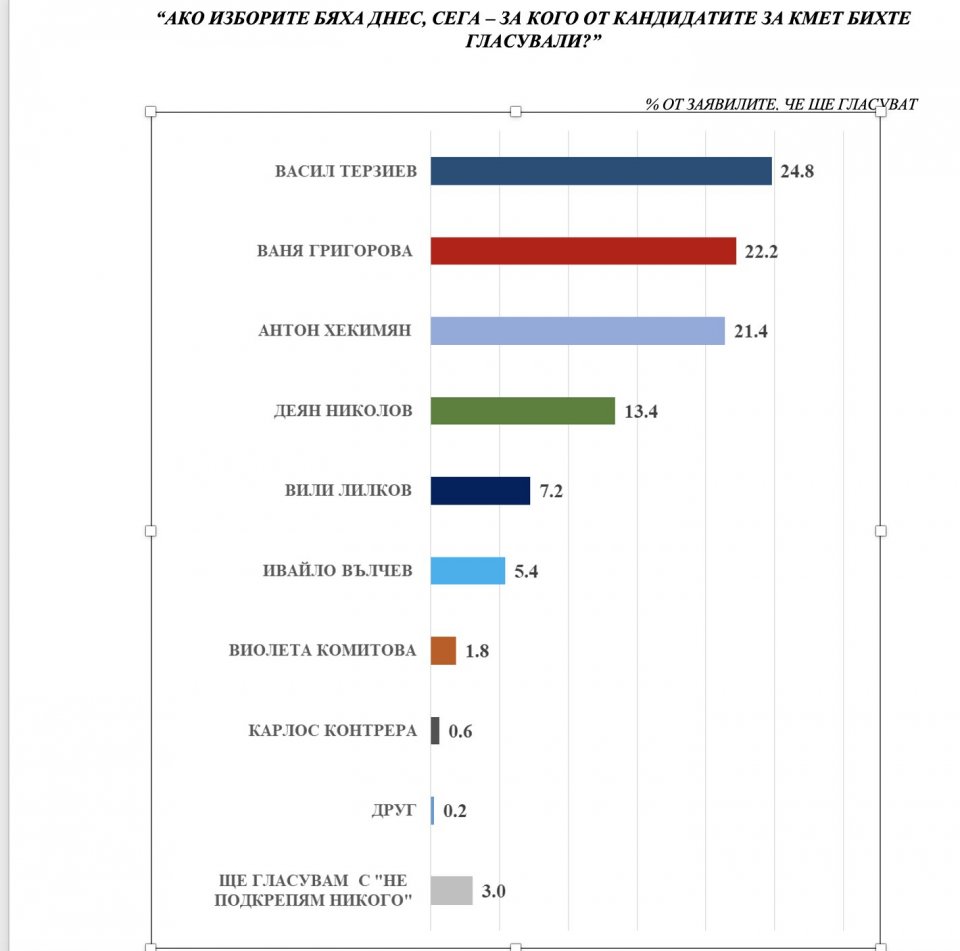 - Без съмнение изборите за кмет на София ще се решат на балотаж като най-вероятните двойки са три: Терзиев срещу Григорова; Терзиев срещу Хекимян; Григорова срещу Хекимян. Към момента, тук отново се сблъскваме с пълна непредсказуемост. На практика и трите хипотетични балотажа разиграни от нас завършват с един и същ резултат 50:50.