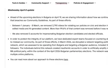 От социалната мрежа допълват, че между 1 януари и 8 март са премахнали 3790 видеоклипа с мотива, че нарушават техните политики, засягащи почтеността на изборите, дезинформацията, редактирано медийно съдържание и съдържание, генерирано от изкуствен интелект. Премахнати са и 5 акаунта, които са се представяли като профили на кандидати на избори и избрани длъжностни лица.