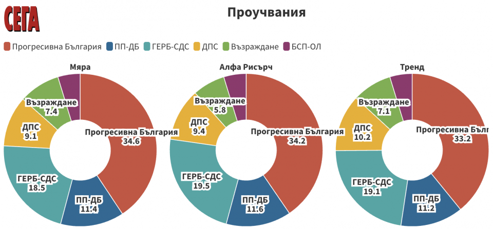 Данните на "Тренд", са, че Прогресивна България получава 33,2% подкрепа сред заявилите, че ще упражнят правото си на глас. Втори са ГЕРБ-СДС с 19,1%. Битката за третото място остава оспорвана, като ПП-ДБ (11,2%) запазва крехка преднина пред ДПС (10,2%). Петата позиция остава за „Възраждане“ със 7,1% сред гласуващите.