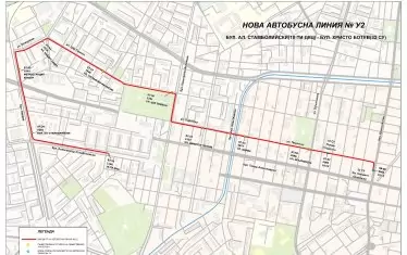 Линия У2 също тръгва от ДКЦ-10, но в 7.35 ч. Голяма част от нейния маршрут се дублира с този на У1. След спирката на трамвай №3 на ул. "Симеон" обаче У2 се отклонява по линията на трамвай 22 на ул. "Димитър Петков", "Одрин" и "Опълченска". Впоследствие спира и пред 18-о СУ, докъдето ходи и У1, преди да остави децата пред 32-о СУ. По част от тези маршрути досега не се движеше градски транспорт, а като цяло районът е с доста интензивен трафик и не малко други възможности за ползване на екологичен обществен транспорт - трамваи, тролеи и метро.