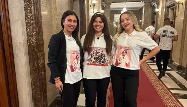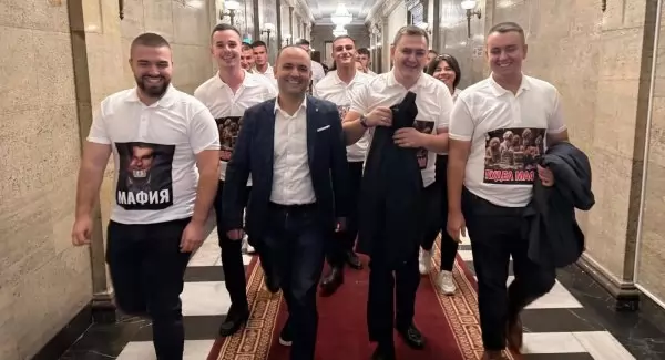 Междувременно членове на младежката организация на ДПС-НН устроиха зрелище (галерия от снимки с младите хора в действие - в края на дописката) в коридорите на парламента - причакваха депутати от ПП-ДБ, за да им раздават тениски с подигравателни надписи.