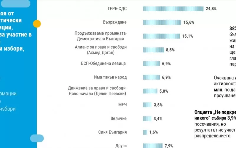 Очаквано ГЕРБ-СДС запазват лидерската си позиция с 24.8% от всички гласуващи. Плътно след „Възраждане“ е ПП-ДБ с 15.1% от гласуващите.