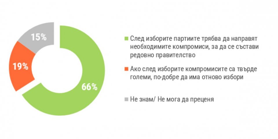 В проучването са тествани две твърдения относно евентуалните компромиси след изборите. Твърдението „след изборите партиите трябва да направят необходимите компромиси, за да се състави редовно правителство“ събира подкрепата на 2/3 от пълнолетните българи, докато 19% са на мнение, че „ако след изборите компромисите са твърде големи, по-добре да има отново избори“.
