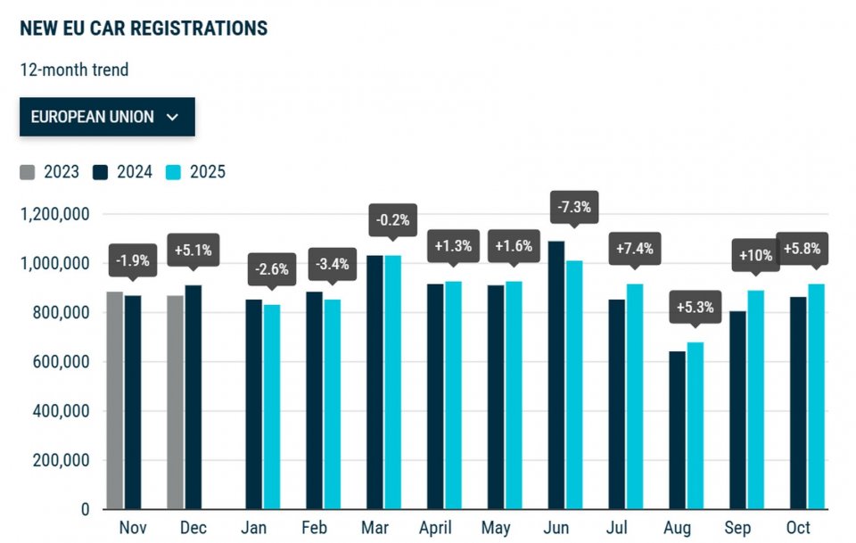 Според данните, в периода януари-октомври 2025 г. в ЕС ръстът на продажби е едва 1.4%, докато за България той е 13.5%. В абсолютни стойности това изглежда по следния начин: 8 974 026 пласирани нови коли тази година в Евросъюза, срещу 8 853 301 за първите 10 месеца на 2024-а; а за България съотношението е 41 148 към 36 255 броя, или 4893 повече.
