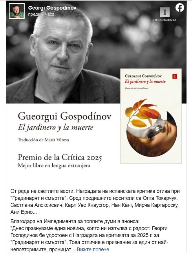 Романът "Градинарят и смъртта" на Георги Господинов спечели Наградата на испанската критика за най-добра чуждестранна книга за 2025 г., съобщи той с пост в социалните мрежи.