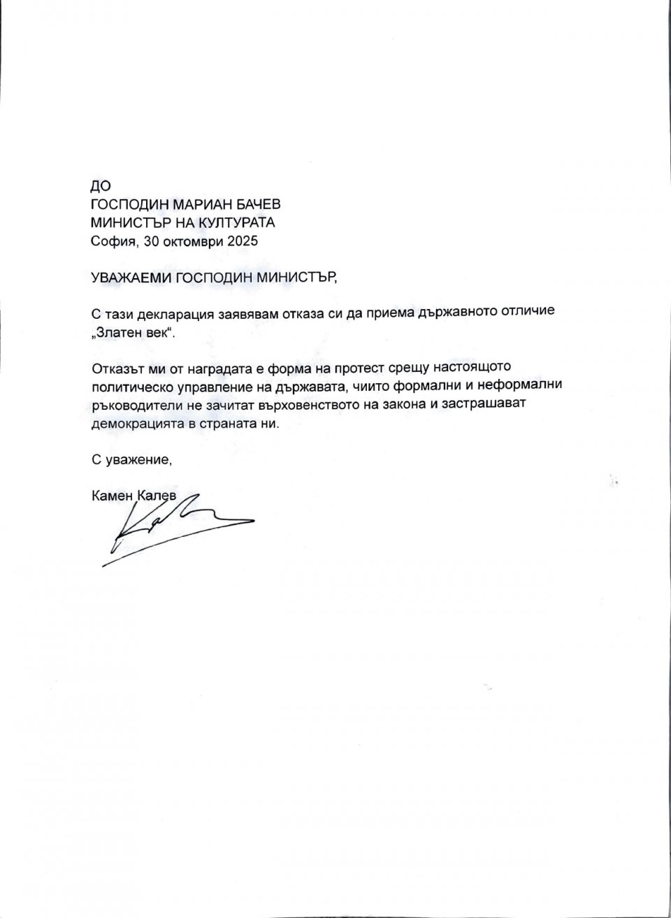 "Отказът ми от наградата е форма на протест срещу настоящото политическо управление на държавата, чиито формални и неформални ръководители не зачитат върховенството на закона и застрашават демокрацията в страната ни", мотивира той отказа си от държавното отличие. Калев подчерта пред "Сега", че причина за решението му не са конкретно личността на министър Мариан Бачев и събитията около него от последните дни.