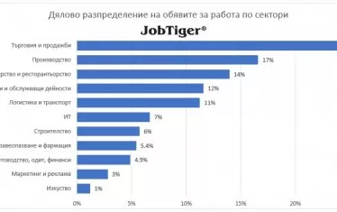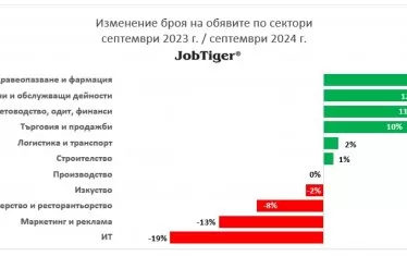 Спрямо миналата година има разнопосочни промени в търсенето на работници и служители по сектори - например в сферата на туризма делът на обявите се е свил с 8% (над 500 обяви по-малко). А в сферата на информационните технологии спадът е направо драматичен - с 19 на сто, което потвърждава коментарите за край на бума в ИТ сектора у нас.