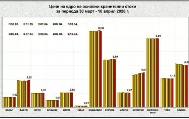 Пакетче краве масло от 125 гр. се продава по 2,07 лева (намалние с 1.1%). Пилешкото месо си остава по 4,15 лв., а захарта поевтинява с 0,7 на сто и се продава по 1,42 лв./кг. Брашното, тип "500" на едро е над 1 лв . - 1,01 лв/кг. (увеличение с 1%). Цената на ориза се качва с 2% (2,07 лв.). Яйцата се продават средно по 0,21 лв. за бройка (+1.01%).