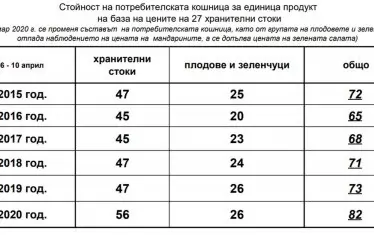 Така наречената "потребителска кошница", която включва 27 вида основни хранителни продукти, през 2020 г. е 82 лв. месечно. През 2019 г. е била 73 лв., а през 2018-а - 71 лв. В методологията от 30 март отпада следенето на цената на мандарините, а вместо това в статистиката се включва зелената салата, която тази седмица има непроменена цена на борсите - 0.67 лв.