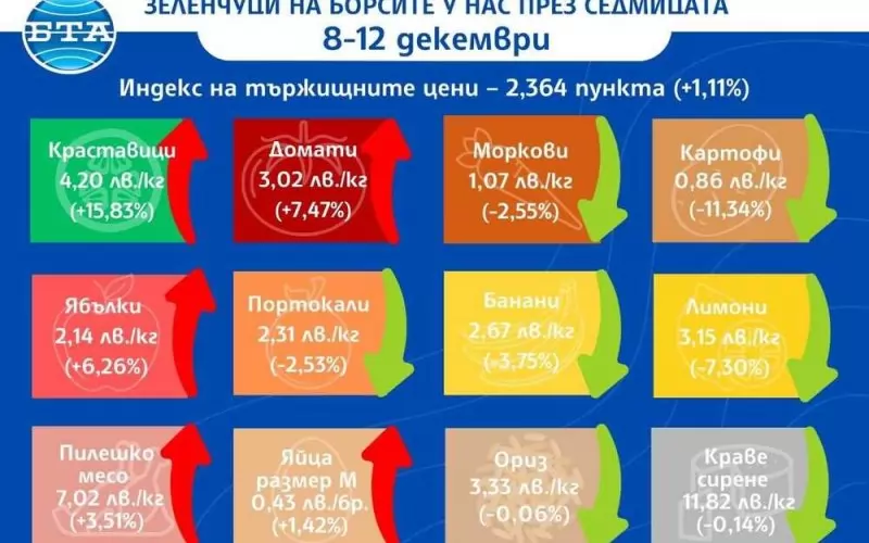 При плодовете понижаване на цената тази седмица се отчита при лимоните - със 7,30 на сто до 3,15 лв. за килограм, при бананите - с 3,75 на сто до 2,67 лв. за килограм, и при портокалите - с 2,53 на сто до 2,31 лв. за килограм. Поскъпват ябълките, които са с 6,26% нагоре до 2,14 лв. за килограм, и гроздето, което се търгува с 2,10% по-скъпо - по 3,02 лв. за килограм.