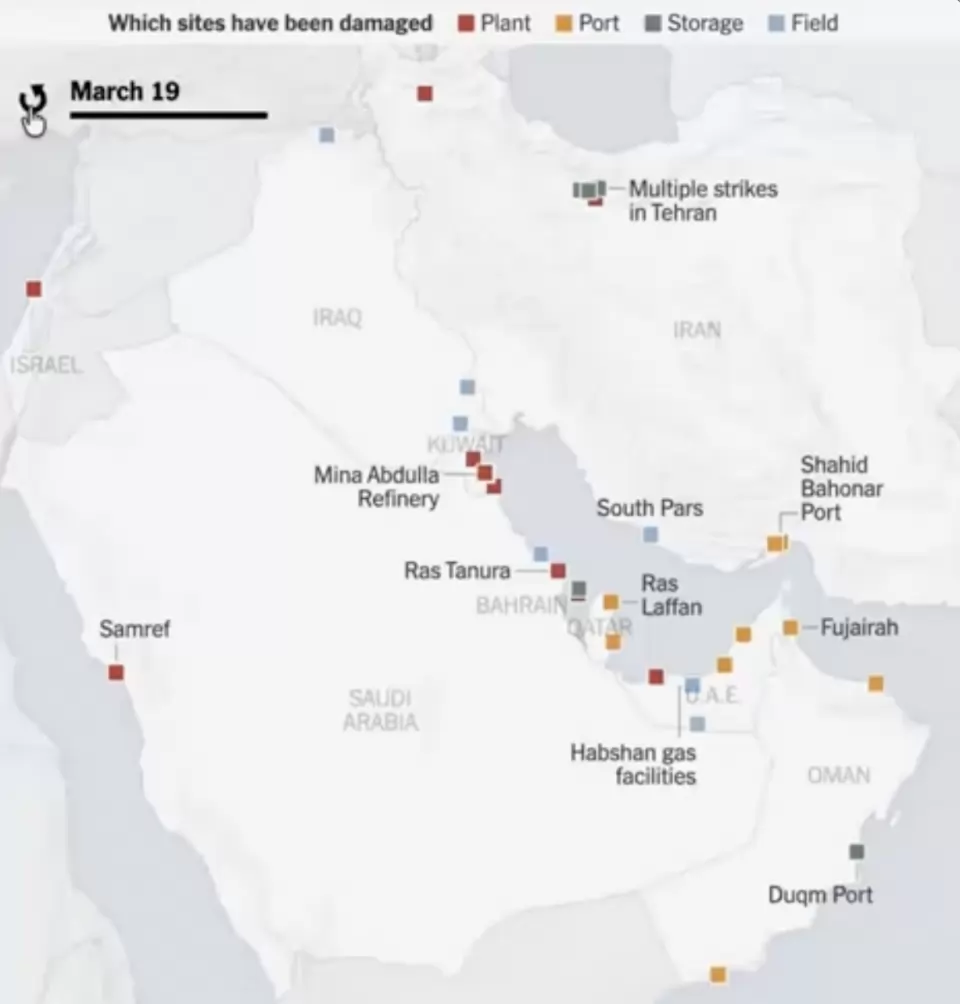 От началото на войната в Близкия изток са повредени най-малко 39 енергийни обекта в 9 държави. Става въпрос за петролни рафинерии, газови находища и ключова инфраструктура, съобщава The New York Times.