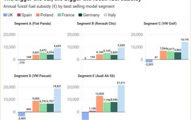 "Шампион" се оказва Италия с 16 млрд. евро субсидии за служебни автомобили, задвижвани с изкопаеми горива. Втора е Германия с 13.7 млрд. евро. Далеч след тях, но също с впечатляващи бонуси, са Франция и Полша (съответно 6.4 млрд. евро и 6.1 млрд. евро годишно), показва проучването на консултантската компания Environmental Resources Management.